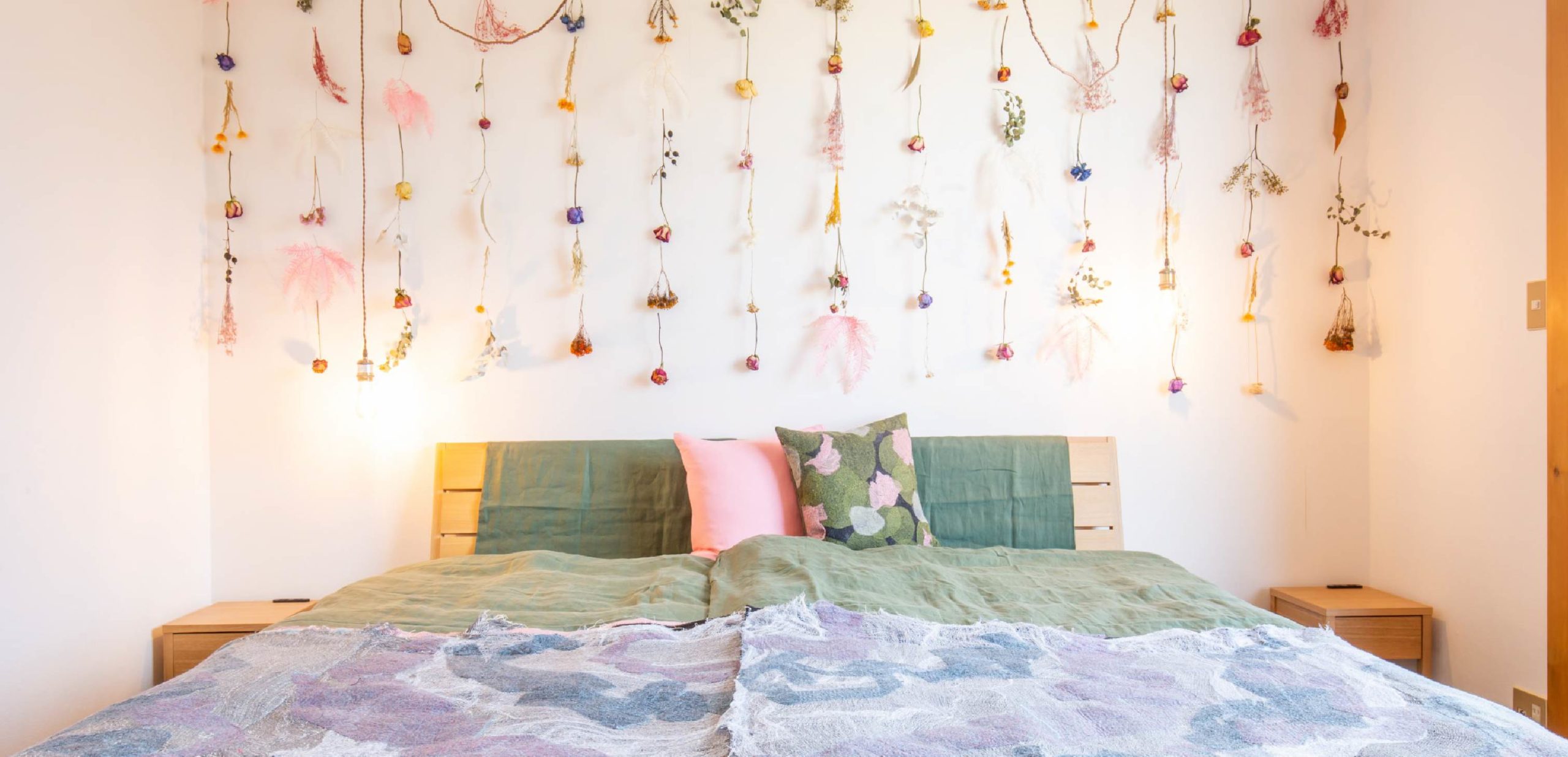 富士山を一望できる一棟貸切の宿。 古民家ならではの味わいと、サスティナブルをテーマに再生したリノベーションホテルです。 何気ない富士吉田の“あの日”の情景を、使わなくなったテキスタイルを利用して表現したかわいいクッション。ロス・フラワーを使った大きなリース。ひとつひとつが手作りで、世界でここにしかないホテルを誕生させました。